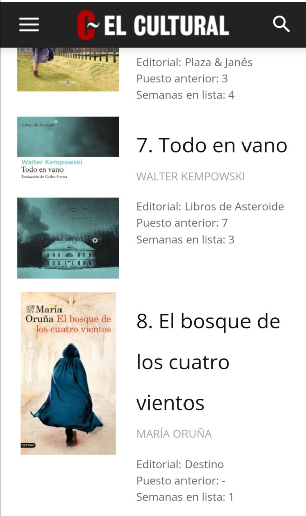 Los datos los aporta El Cultural en el siguiente link: MÁS VENDIDOS EL CULTURAL
