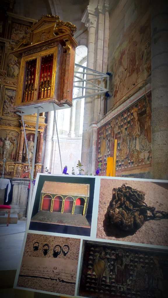 Los visitantes también podrán ver los antiquísimos relicarios que se detallan en El bosque de los cuatro vientos: en sus pequeños sarcófagos se encontraron cuatro de los nueve anillos de la leyenda. Ahora parecen flotar en el aire, pues han ingeniado un sistema movible para que queden suspendidos a tres metros sobre el suelo y se puedan replegar a su lugar original cuando se desee; el motivo es poder mostrar los frescos que se hallaron al retirarlos para su restauración, y que datan del siglo XV. Fue Vania López la que restauró estas pinturas y los relicarios, y es, como muchos saben, quien encontró los anillos de la leyenda. Los curiosos podrán ver también la sacristía del siglo XVII, hasta ahora cerrada al público, y que alberga el sorprendente armario-relicario que también se describe en la novela.