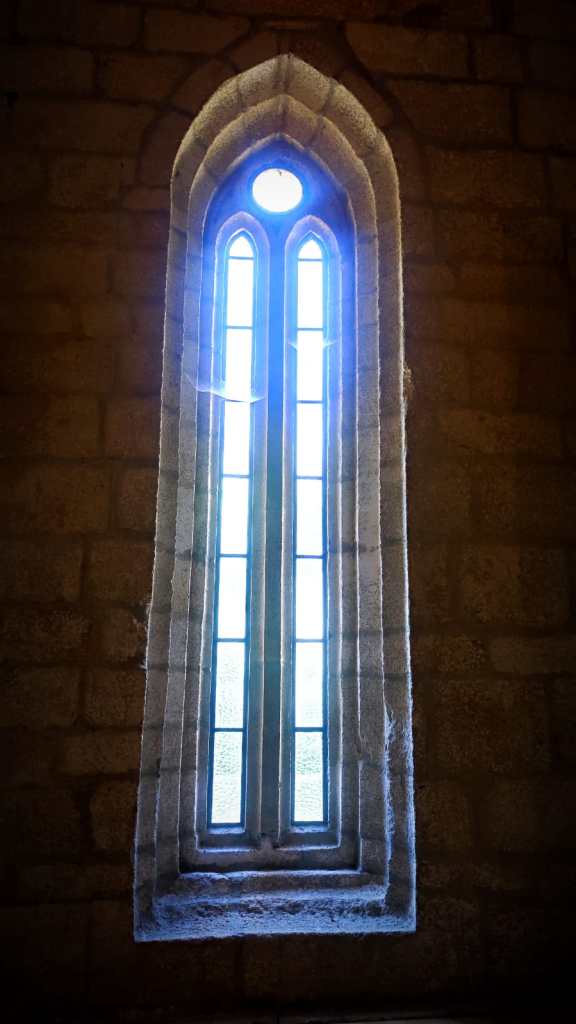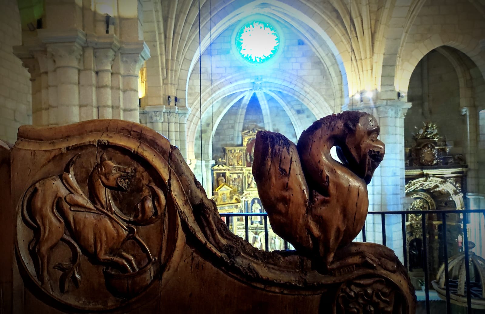 He estado en Santo Estevo hace solo unos días, en plena ola de calor. Sin embargo, el viejo monasterio me recibió envuelto en la niebla, como si perteneciese a otro mundo. La Diócesis de Ourense ha organizado cinco visitas diarias (mientras no terminan su nueva página web, pueden reservarse en el teléfono 676.06.55.67 y en el correo iglesiasantoestevo@gmail.com ), en las que pueden verse el nuevo coro, que se alza impresionante bajo los rayos azules de los rosetones: en él, han puesto la antigua sillería que estaba en el altar, bajo los restos de los obispos, y que tras su restauración resulta imponente.