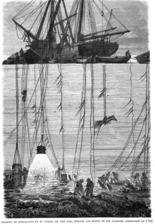 «En el interior de la ría de Vigo, desparramados en acantilados y recovecos submarinos, se conservan restos de batallas navales, naufragios y vidas piratas, como si la ría fuese, en realidad, una serpiente marina que ha engullido parte de la historia.«