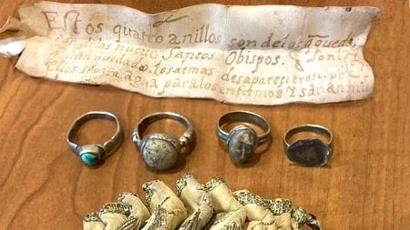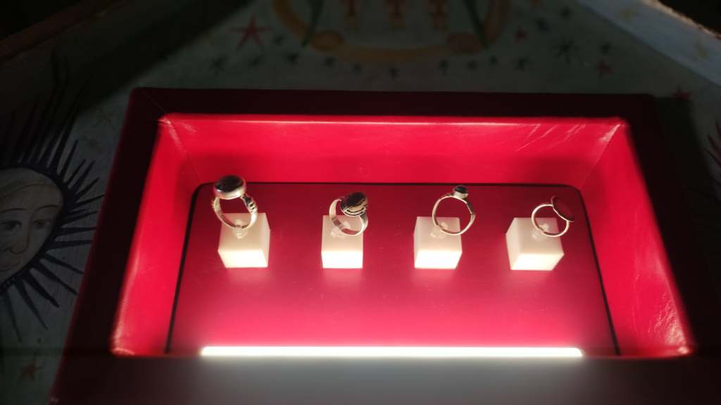 Estos quatro anillos son de los que quedaron de los nueve Santos Obispos. Son los que han quedado. Los demás desaparecieron. Por ellos se pasa agua para los enfermos y sanan muchos.