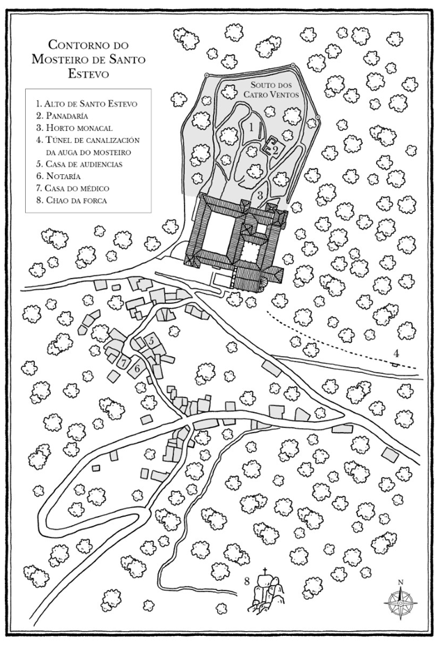 El bosque de los cuatro vientos se desarrolla, casi exclusivamente, en Santo Estevo; una localidad perteneciente a Ourense y donde se encontraba el monasterio benedictino de San Esteban, conocido por sus escudos de nueve mitras, en razón de los nueve santos obispos que fallecieron allí entre los siglos X y XI. Sus anillos episcopales, guardados en una caja de plata, decían que producían milagros y que sanaban a los enfermos, aunque hay quien piensa que aquello era solo un mito, conocido como «La leyenda de los nueve anillos«.