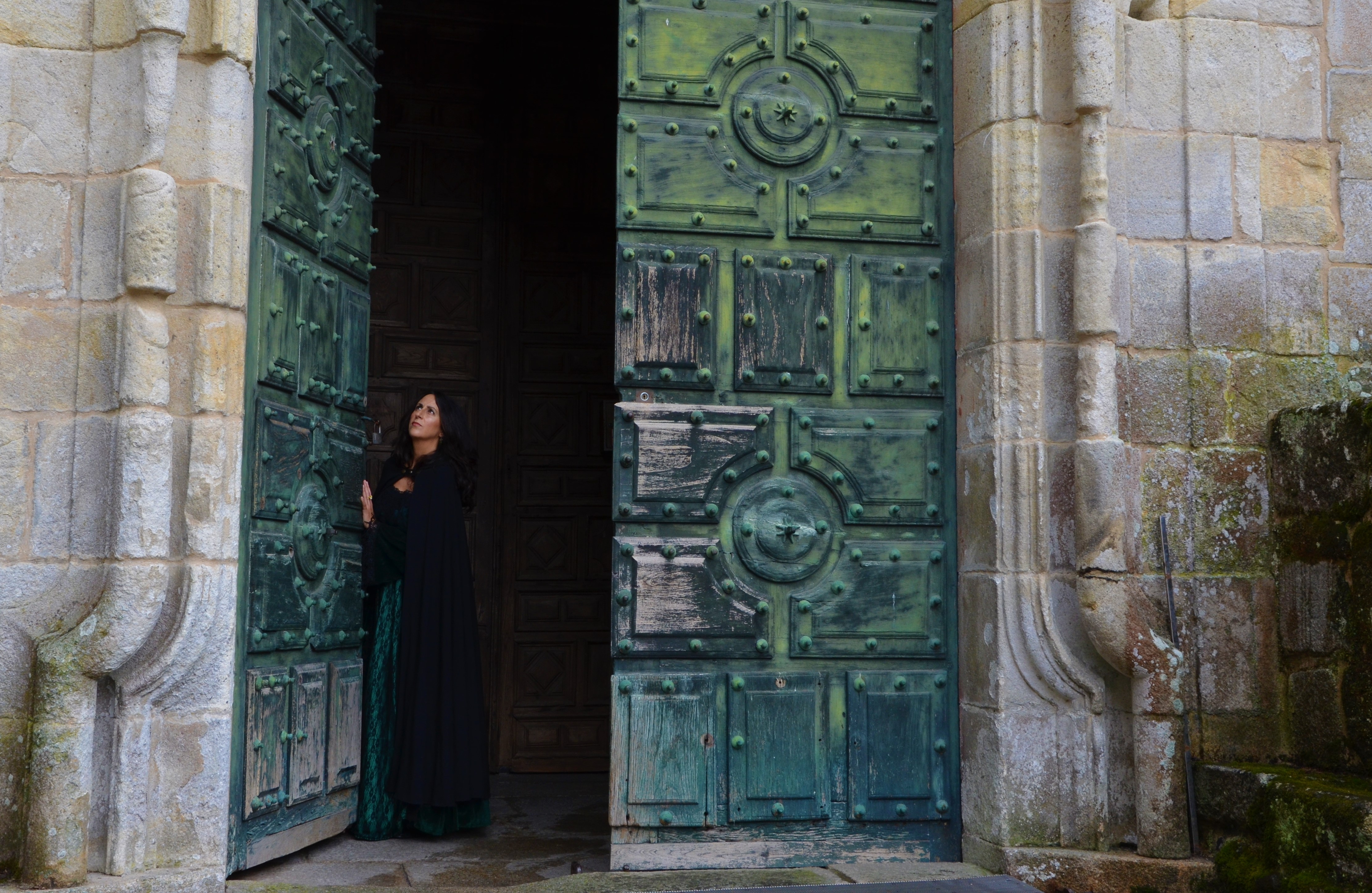 María Oruña, caracterizada, frente al altar de la Iglesia de Santo Estevo. A ambos lados del altar, en lo alto, se encuentran los relicarios donde de forma posterior fueron encontrados 4 de los 9 anillos de la leyenda.«Era como si supiese que estaba a punto de entrar en un mundo en el que una noche podía durar siglos, en el que lo inasible, lo imprecisable, podía tener explicación. Sin saberlo, desde que había llegado a Galicia, había comenzado a viajar por las trenzas del tiempo.»