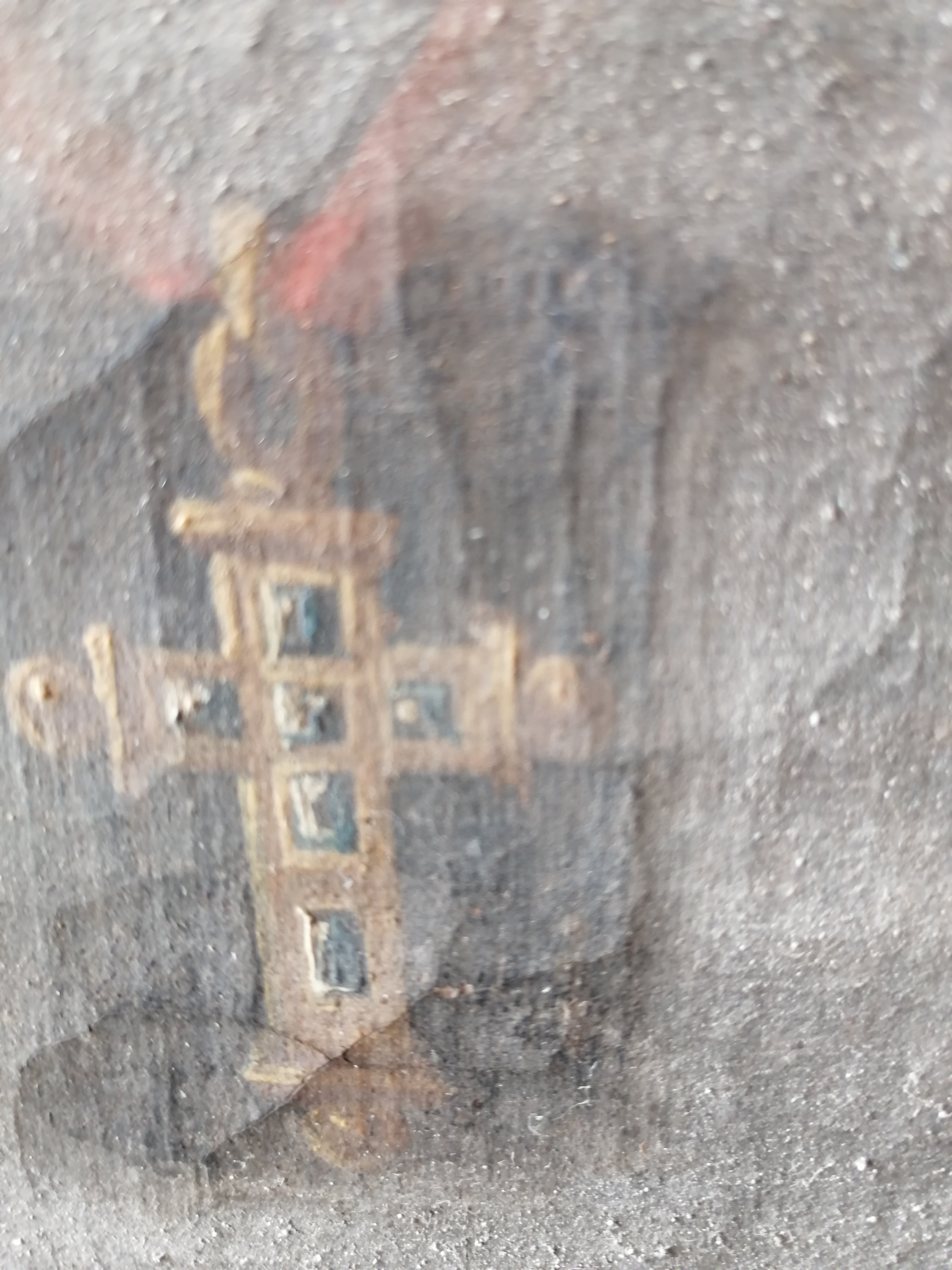 Relicarios de los obispos restaurados en su soporte aéreo móvil. Tras ellos, los frescos del siglo XV encontrados en 2020, restaurados por Vania López. Imagen tomada en julio 2024.